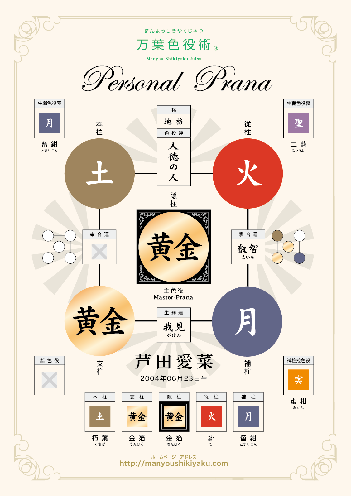 主色役【黄金】=人徳の人は、何事にも安易な妥協を許さず、心の裡に秘めた思いを主張し、自らの存在感を誇示する全体の統率者